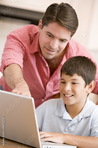 father, son, computer, laptop, homework, kitchen, technology, 30s, home, boy, hispanic, latin, day, daytime, male, man, 30s, vertical, indoor, inside, father, eltern, people, seated, desk, sitting, smile, smiling, racked, standing, techno, two people, young boy, browsing, surfing, cyberspace, online, together, research, researching, working, watching, explaining, helping, children, children