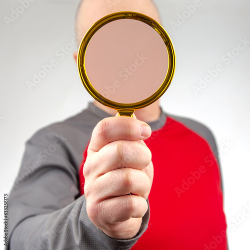 man hides his face with a magnifying glass. The concept of searching for a person in a database. Look at the world incognito. anonymous behind the curtain