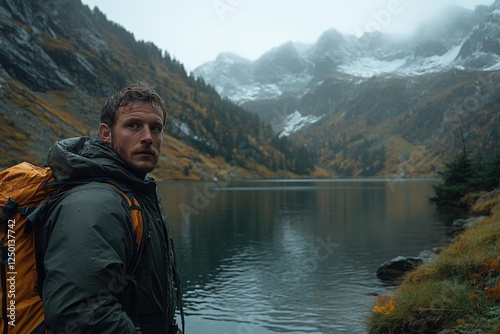man, nature, mountain, lake, forest, outdoors, hiking, travel, adventure, landscape, water, autumn, traveler, exploration, rocky, calm, view, clothing, backpack, grey, green, brown, orange, cloud, misty, still, sharpened