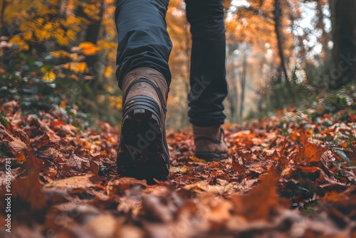 Man hiking on a trail covered in a blanket of fallen leaves - Autumn Adventure
