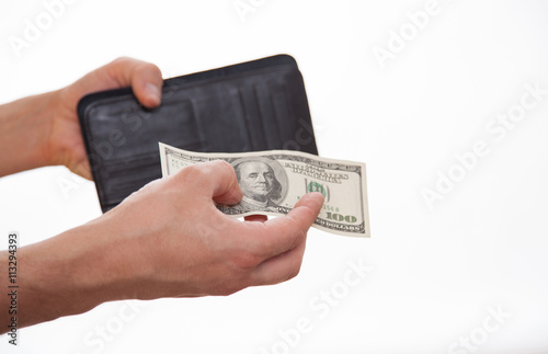alms, american, banknote, black, business, businessman, capital, cash, charity, credit, currency, demonstrate, dollar, earning, finger, give, hand, hold, income, leather, male, man, money, paper, partner, pay, payment, person, pouch, proceed, profit, purse, reach out, revenue, salary, savings, show, success, successful, wages, billfold, white background