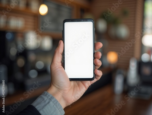 Man holding a smartphone with a blank screen in the background is blurred.