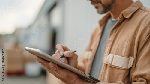 man, holding, tablet, hand, wearing, beige, jacket, pen, hand, background, blurred, warehouse, storage, area, box, item, visible, focused, digital