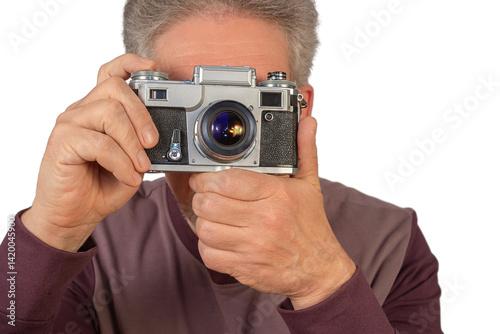 Man holding a vintage camera and preparing to take a photograph, isolated on transparent background