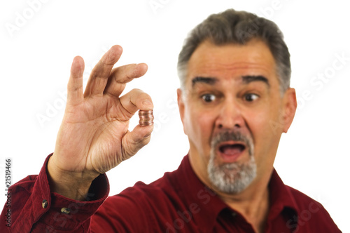 man, mature, money, penny, change, coin, currency, holding, pinch, surprise, awe, 50s, adult, beard, bunch, casual attire, caucasian, clothing, copper, expression, face, finger, goatee, grey, grey, group, hair, hand, image, indoor, male, moustache, mouth, 1, open, person, posing, red, burgundy, shiny, shirt, shock, short, squashes, stack, white, background