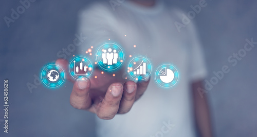 Man holding icon of digital marketing internet and sales increase business technology. Business, E-commerce, Big data analytics, and Business Online.