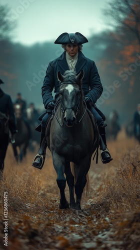 horseback, riding, man, autumn, forest, historical, attire, group, ride, landscape, equestrian, equestrianism, gentleman, fall, nature, travel, history, colonial, soldier, military, wood, tree, coat, hat, horse, grey, dark, winter, season, person, people, scene, image, photo, picture, background, view, adventure, journey, path, way, exploration
