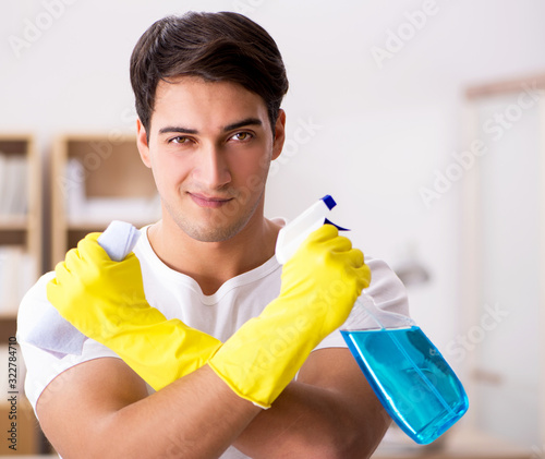 Man husband cleaning the house helping wife