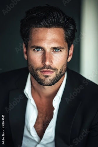 man, blazer, blue eye, dark hair, piercing, model, portrait, fashion, style, masculinity, sharp, charisma, presence, sophistication, elegance, formal, modern, striking, seriousness, power, hero, timeless, stare, photo, editorial, professional, male model, allure, character, boldness, composure, sleek, sharpness, intensity