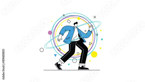 Man in a blue jacket walking through glowing rings of light and colorful geometric shapes representing progress and innovation.