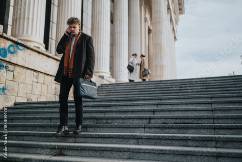man, coat, foulard, phone, briefcase, step, stair, winter, cold, urban, city, business, professional, attire, shoe, boot, fashion, street, building, column, architecture, grand, government, historical building, stone, grey, graffiti, wall, background, people, group, walking, businessman, serious, focused, expression, travel, commute