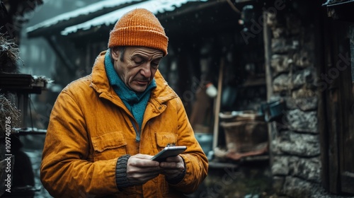 Man in a knit hat and yellow jacket using a smartphone near a wooden shed symbolizing tradition resilience and technology integration in rural farming practices