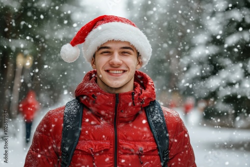 Man in a red jacket and a santa hat is smiling in snow. Concept of joy and happiness, as the man is enjoying winter weather atmosphere. young smiling man in red jacket and santa hat running in winter