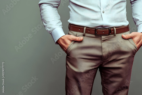 man, person, shirt, white, trousers, pant, brown, belt, fashion, pose, style, model, formal, casual attire, outfit, clothing, clothes, photo, studio, portrait, apparel, professional, wear, racked, menswear, gentleman, tailored, elegance, grooming, design, wearable, man, photogenic, trendy
