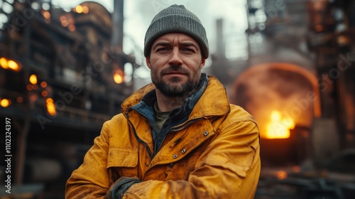 Man in a yellow jacket stands in front of a factory with a fire in the background. He looks serious and focused
