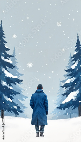 man, coat, blue, winter, snow, forest, tree, pine, nature, outdoors, cold, landscape, scenic, snowy, solitude, style, standing, backview, walking, chilly, tranquil, peaceful, cold weather, seasonal, white, frosty, atmosphere, serene, adventure, exploration, winter scenery, calm, stillness, snowflake, deep blue, glacé