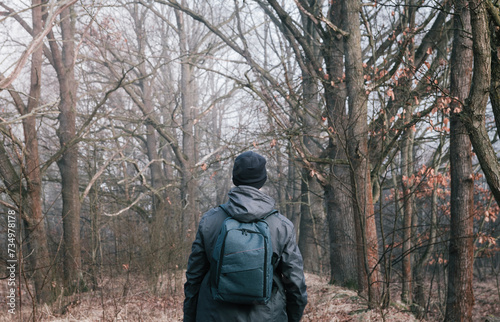 Man in cap and jacket walking through fog forest with backpack. Nature, travel background