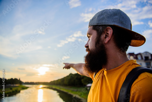 man, sunset, bridge, river, sun, guy, evening, landscape, front, admire, blue, sky, time, enjoy, pleasant, moment, cap, while, racked, take, nature, beauty, bearded, beard, hipster, unshaved, moustache, masculine, brutal, adult, stylish, leisure, rest, relax, hobby, photogenic, horizon, sunlight, wanderlust, idylli, backpacker, traveler, discover, summer, vacation