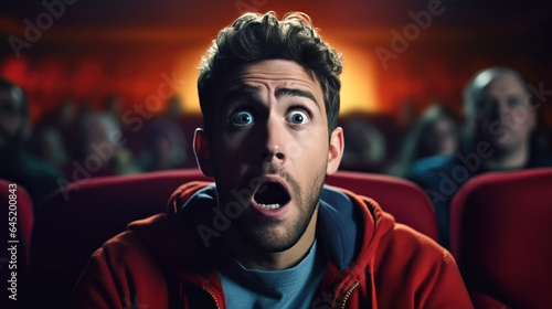 Man in casual clothes with astonished and surprised look watching a movie in a cinema. Generative AI