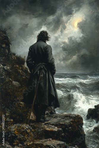 man, coat, ocean, stormy, sea, wave, cliff, rock, back, wind, dark, cloud, sky, moon, gloomy, dramatic, solitude, contemplation, landscape, nature, coastal, brooding, pensive, mysterious, moody, romantic, picturesque, wild, view
