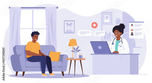 man, patient, doctor, consultation, online, health care, medicals, appointment, virtual, couch, sofa, sitting, laptop, desk, stethoscope, coat, uniform, goggles, woman, professional, health, care, medicine, technology, communication, screen, digital, service, support, assistance, advice, treatment, diagnosis, exam, check-up, wellness, well-being, lifestyle, modern, interior, room, home, office, clinic, illustration, vector, cartoon, graphic