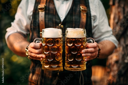Man in floral-embroidered vest holding two beer mugs, celebrating Oktoberfest in traditional Bavarian style.