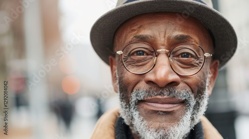 horizontal, portrait, older, man, smiling, camera, city street, urban, confident, relaxed, cheerful, vibrant, modern, stylish, casual attire, city life, trendy, natural, self-assured, lifestyle, metropolitan, dynamic, expressive, warm, friendly, mature, professional, bright, contemporary, male, fashion, fashionable, senior, eyeglass, goggles, afro, african, black, hat