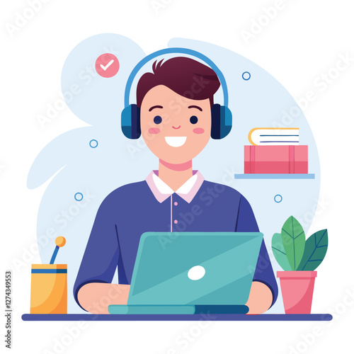 man in headphones, studying at laptop. Happy female student watching business webinar. Video conference call, remote work communication. Flat vector illustration isolated on white background