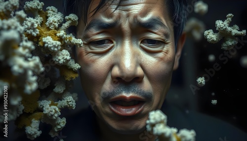 Man in his 40s with a pained expression due to mold allergy, surrounded by clusters of white and green mold dust particles floating in the air