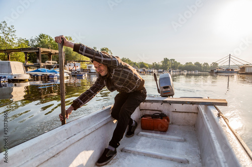 man, old boat, boat, rowing, spring, morning, sunrise, caucasian, river, oar, boat, tree, background, house, hobby, paddle, paddling, water, activity, leisure, fisherman, sunlight, sun