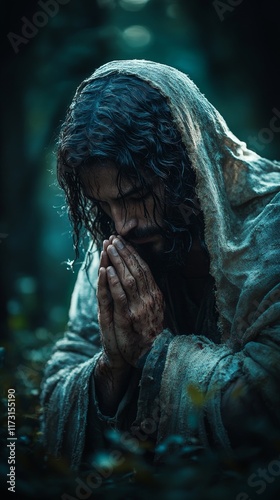 prayer, man, hood, forest, devotion, solemn, spiritual, faith, meditative, peaceful, contemplative, nature, serene, worship, humbleness, introspection, sacred, solitude, quiet, connection, religious, mystical, calm, natural light, atmosphere, hope, rustic, meditation, reverence, stillness, thoughtful