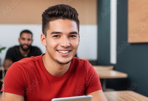 people, man, male, smiling, red shirt, desk, charming, office, comfortable, positive, friendly, approachable, modern, young adult, technology, digital, wireless, productivity, corporate, connectivity, cheerful, welcoming, sociable, engaging, upbeat, happy, professional, collaborative, contemporary