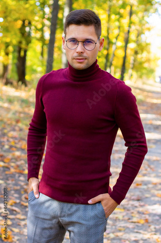 Man in red turtleneck in the forest, Man in red turtleneck