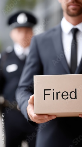 Man in suit holding box labeled Fired, being escorted out of office by security guard, conveying a moment of professional dismissal