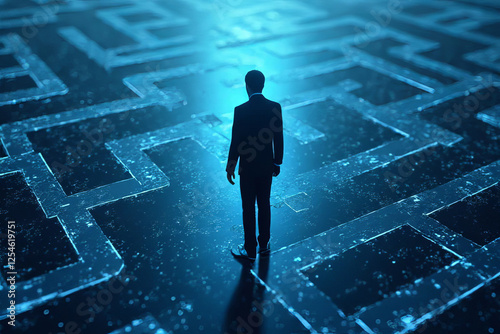 man, suit, labyrinth, glowing, technology, contemplation, dark, abstract, labyrinth, business, decision, challenge, mystery, silhouette, blue, digital, future, strategy, problem solving, journey, uncertainty, innovation, exploration, perspective, depth, light, design, environment, space, direction, thinking, corporate, vision, complexity, navigation, path, obstacle, modern, creative, idea, concept, virtual, enigmatic, figure