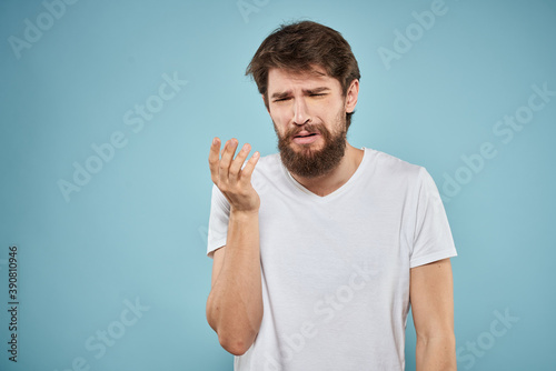Man in white t-shirt emotions facial expression cropped view studio blue background lifestyle