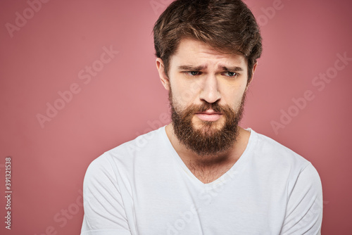 Man in white t-shirt emotions lifestyle facial expression cropped view pink background.