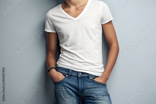 Man in White V-Neck T-Shirt and Jeans: A close-up shot of a young man's torso, showcasing a simple yet stylish white v-neck t-shirt paired with light blue jeans.