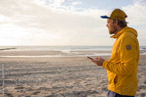 people, jacket, smartphone, beach, copy space, travel, paint, mobile, sand, beard, baseball, outdoors, destination, leisure, day, wireless, connection