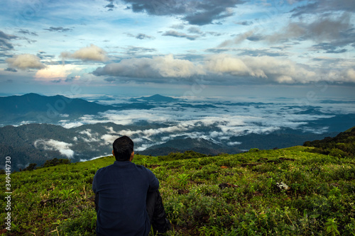 man isolated feeling the serene nature at hill top with amazing cloud layers in foreground