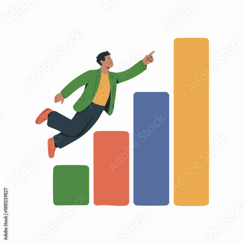 man, jumping, graph, bar, chart, datum, statistic, success, growth, progress, achievement, business, finance, analysis, illustration, cartoon, vector, colourful, bar, ascending, upward, trend, increase, improvement, optimism, confidence, energetic, dynamic, motion, movement, leap, jump, male, person, human, figure, silhouette, pose, action, activity, businessman, entrepreneur, professional, office, work, metric, measurement, evaluation, assessment
