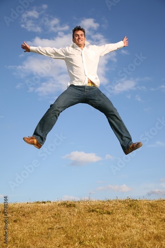 man jumps on meadow