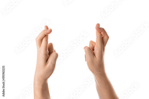 Man keep fingers crossed, hand gesture. Isolated on white background.