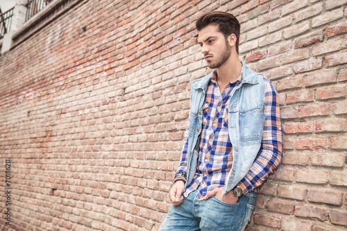man, male, guy, young, fashion, model, look, people, person, happy, smile, sexy, photogenic, attractive, cute, hair, style, coiffure, casual attire, jean, shirt, clothes, white, handsome man, cool, caucasian, latin, outside, brick, wall, urban, city, pose, lean, against, near, side, half face, away, hold, hand, pocket, down, looking down