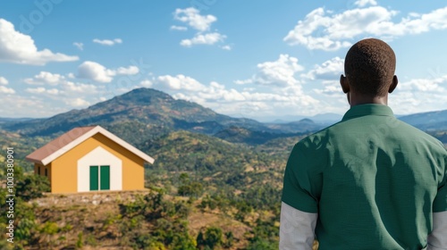 man, person, african, african american, black man, male, looking, viewing, scenery, landscape, mountain, mountain, hill, hill, house, building, structure, home, sky, cloud, green, blue, rural, countryside, nature, travel, destination, scenic, beautiful, panoramic, vista, distant, bright, daytime, sunny, day