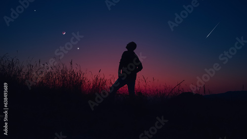 astronomic, star, space, galaxy, man, male, guy, person, starlight, starry, planet, milky way, astronomy, astrology, universe, cosmos, science, night, sky, dark, twinkle, watching, horoscope, looking, cosmic, astronomer, shooting star, falling star, observing, meteor, nature, eclipse, celestial, twilight, evening, moon, crescent moon, conjunction, silhouette, jupiter, venus, mars, saturn