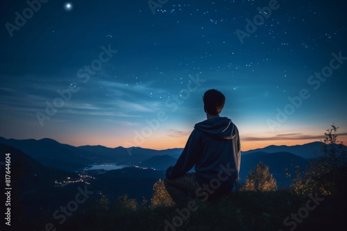 man, looking, starry, sky, crescent, moon, shooting, star, blue, hours, twilight, time, night, cosmos, astronomy, celestial, observation, gaze, wonder, space, universe, star, evening, silhouette, awe, nature, dark, beauty, peaceful, exploration