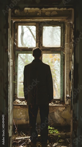 man, window, building, alone, sad, dark, mysterious, abandoned, decay, ruin, stalker, creepy, eerie, apocalyptic, desolate, derelict, forlorn, forsake, haunted, ominous, menacing, threatening, hostile, intimidating, overwhelming, oppressive, claustrophobic, trapped, imprisoned, captive, dominated, controlled, manipulated, used, abused, tortured