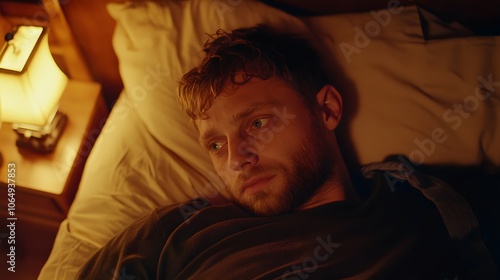 sleep, disorder, insomnia, restless, fatigue, man, bed, night, lamp, glow, calm, uneasy, expression, concern, face, rumpled, wide, open, eye, unable, soft, deep, sleepy, arousing, nocturnal