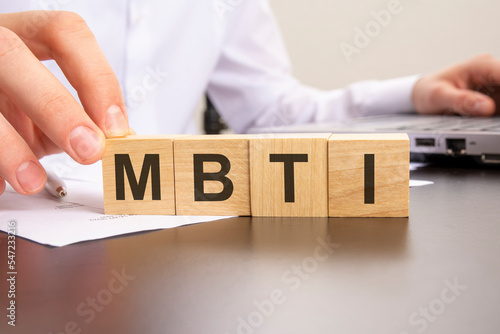 man made word MBTI with wood blocks on the background of the office table. selective focus. business concept.